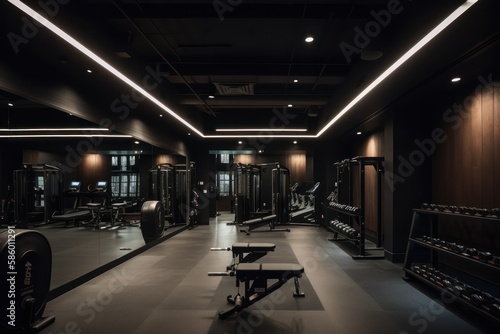 Luxury gym, workout are and treadmill, dark and cinematic lighting, generative ai