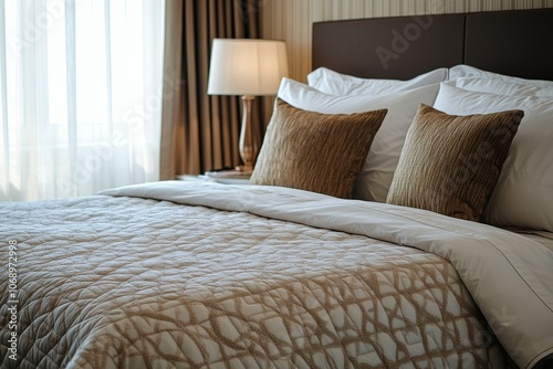Luxury Hotel Bed with White and Brown Pillows and a Beige Quilt