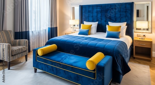 Luxury hotel room with modern design, soft lighting, comfortable bed, colorful cushions, and wooden elements, cozy contemporary bedroom interior for lifestyle and travel concepts