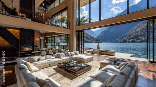 Luxury Lakefront Living Room, Mountain View, Open Plan Design