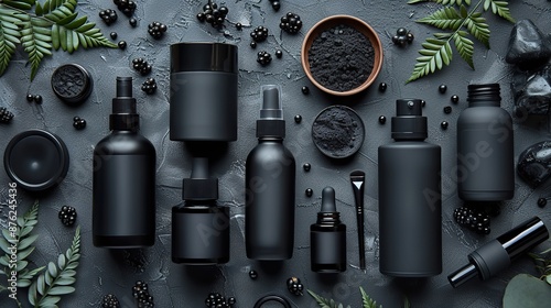 luxury men s cosmetic packaging design black cosmetic bottles on concrete table flat lay top view.stock image