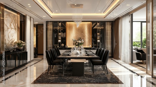 Luxury minimalist interior design of modern living room. Dining room with dining table and black chairs.