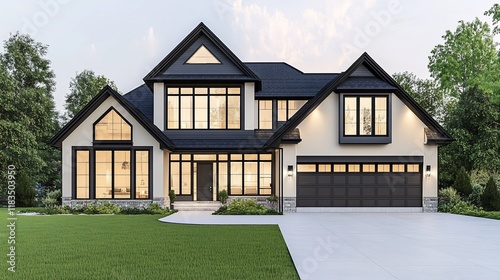 Luxury Modern Home Design: Elegant Two-Story House with Black Windows and Beige Exterior