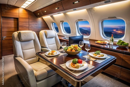 Luxury Private Jet First Class Interior, Entertainment Area, Food Photography