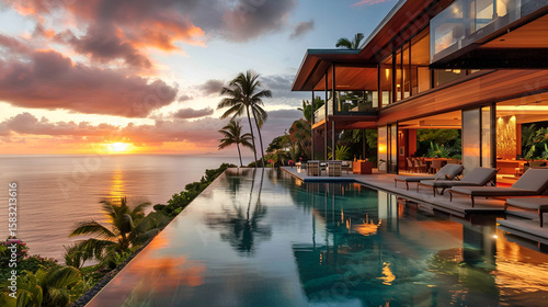 Luxury villa with infinity pool overlooking the ocean at a beautiful tropical sunset