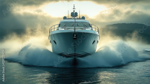 Luxury yacht, powerful propulsion, stormy seas, sunrise backdrop