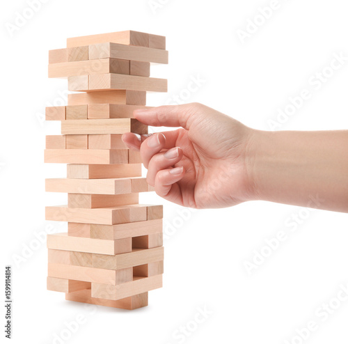 Lviv, Ukraine - December 05, 2023: Woman playing Jenga on white background, closeup