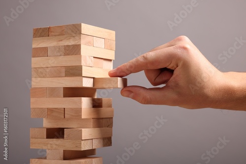 Lviv, Ukraine - December 08, 2023: Playing Jenga. Man removing wooden block from tower on grey background, closeup