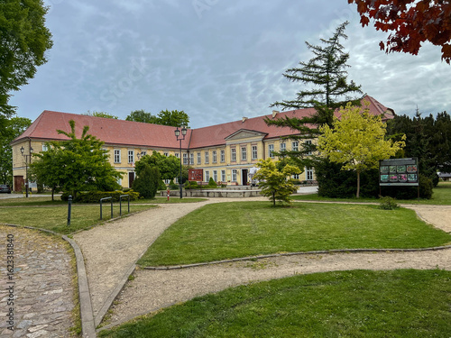 Lyonel Feininger Palace on the Młynowka River in Trzebiatów, Poland, with an elephant next to it