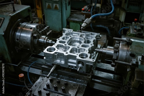 Machine tool processing an aluminum engine block in a manufacturing workshop