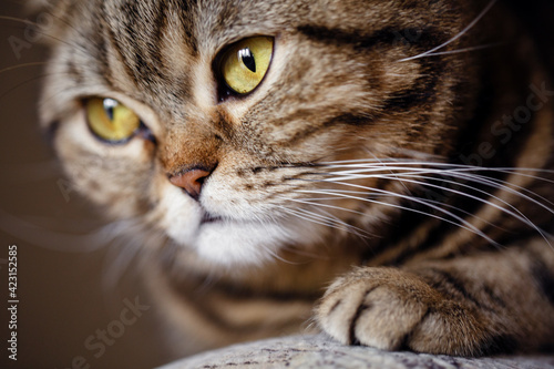 Macro close up portrait of a domestic scottish straight brown tabby pet cat lying on sofa.