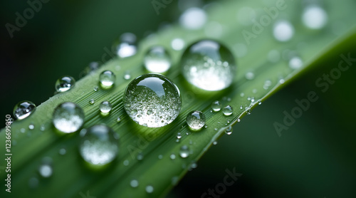 Macro close-up of glistening raindrops on a green leaf showcasing intricate water reflections and delicate textures with crisp focus