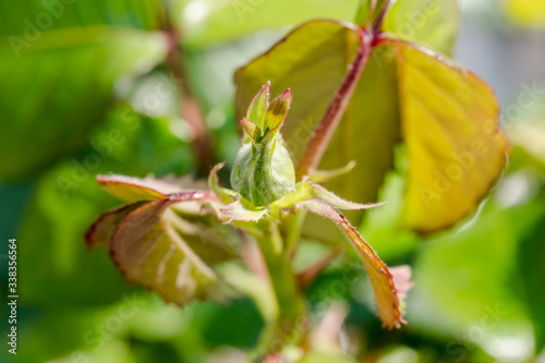 Macro focus, shallow view of a rose bud within a few days of blooming.