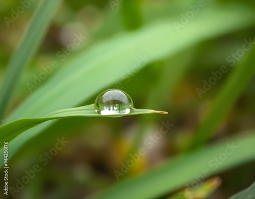 macro imagery of a water droplet resting on a blade of grass, reflecting the surrounding garden scene, with soft bokeh in the background create with ai