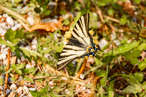 Macro of Iphiclides podalirius, scarce swallowtail butterfly, at the famous Lake Hintersee, Ramsau, Berchtesgadener Land, Bavaria, Germany