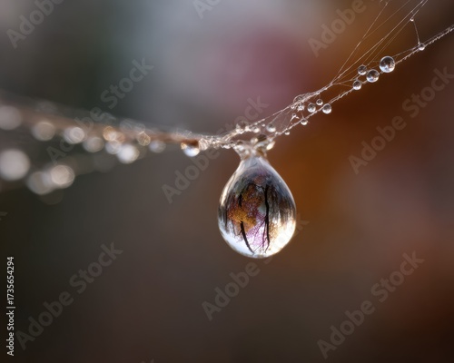 Macro photograph captures dewdrop reflecting autumn forest on spiders web