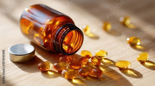 Macro photograph of omega fatty acids supplement capsules in an amber bottle on a light wooden surface