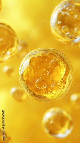 Macro photography of golden liquid spheres with air bubbles floating against yellow background, creating abstract pattern of translucent orbs in warm amber tones.