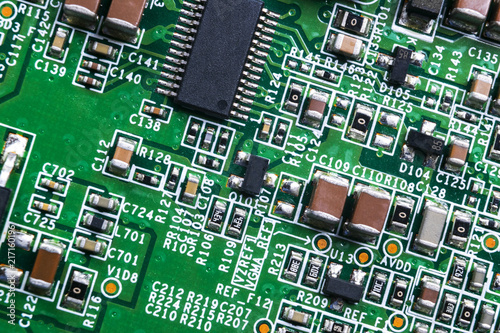 Macro shot of a Circuitboard with resistors microchips and electronic components. Computer hardware technology. Integrated communication processor. Information engineering. Semiconductor. PCB. Closeup