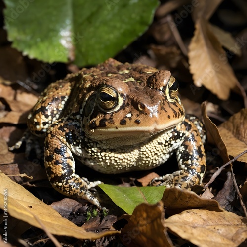 Macro Shot of American Toad on Forest Floor with Dappled Sunlight