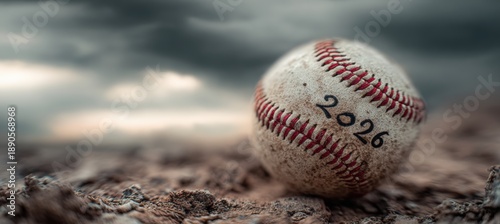 Macro Shot of Baseball with Red Stitching and 2026 Text on Clay Surface