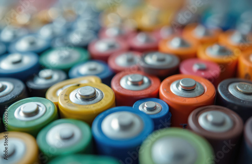 Macro shot of colorful AA batteries, diverse energy sources arranged neatly creating abstract patterns. Selective focus with blurred edges highlights metallic tops, hinting at technology, power,