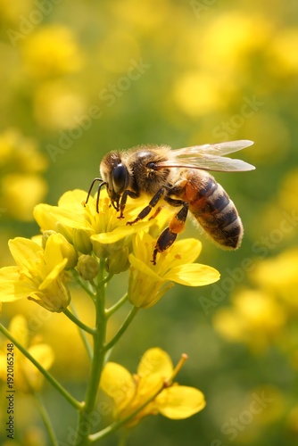 Macro Shot of Honeybee Collecting Nectar from Yellow Mustard Flower - Vibrant Spring Nature Background with Honey Bee Pollinating Wildflowers in Bright Sunlight