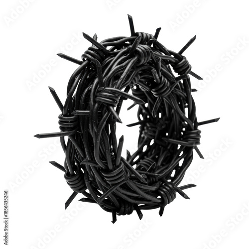 macro shot of tightly coiled black polymer plastic barbed wire with sharp barbs, dramatically lit on a transparent background, conveying artificial danger and constraint