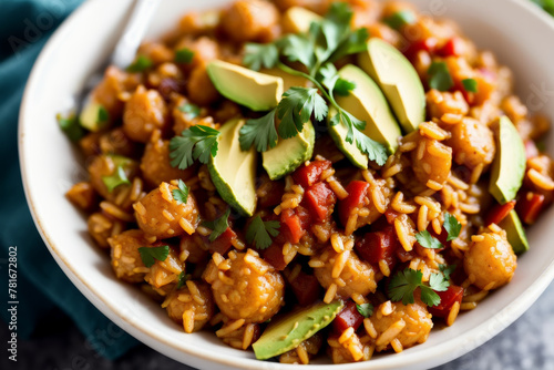 Macro shot of vegan jambalaya with a topping of avocado slices, emphasizing the creamy texture against the spicy base of the dish. AI generated.