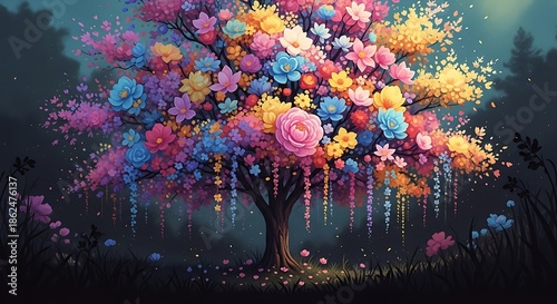 Magical blossoming tree displays vibrant multicolored flowers against a dark woodland background