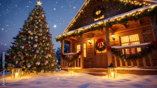 Magical Christmas Eve scene with a decorated wooden cabin and glowing fir tree in the snow. isolated PNG with Transparent Background
