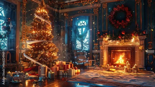 Magical Christmas Interior: Glowing Tree, Fireplace, and Gifts.