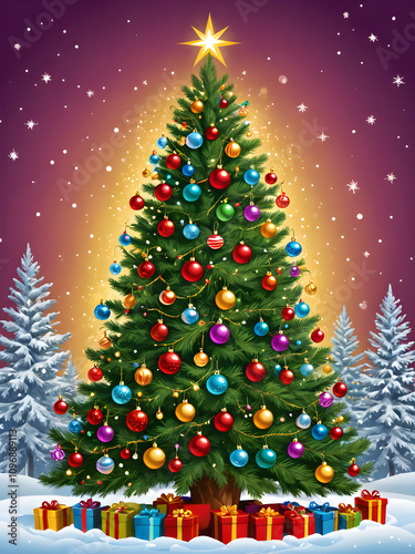 Magical Christmas Tree and gifts. Sparkles with Vibrant Lights and Ornaments on a Snowy night. Beautiful X-mas Background. Generative AI