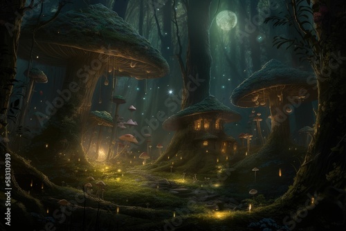 magical mushrooms in the dark forest. Generative AI