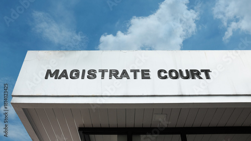 Magistrate Court sign on a building against a clear blue sky, symbolizing judicial system, minor offenses, legal proceedings, justice, and local authority