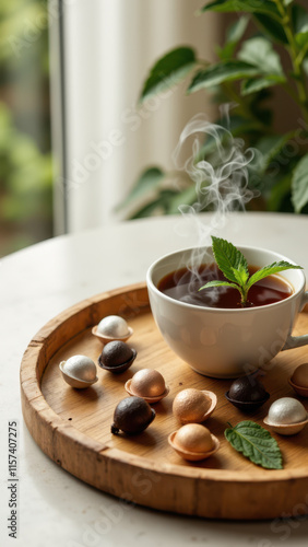 Magnesium supplement tea time with steaming cup and herbal additives on rustic tray.