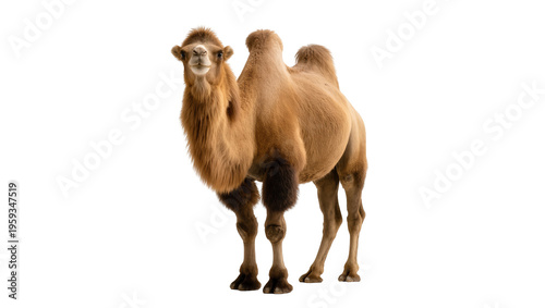 Magnificent fluffy brown Bactrian camel standing tall and proud, looking directly at viewer