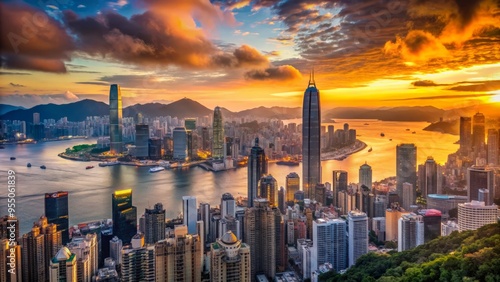 Magnificent panorama of Hong Kong's towering skyscrapers, bustling streets, and vibrant cityscape at sunset, with Victoria Harbour's calm waters reflecting the urban grandeur.