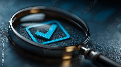 Magnifying Glass Examines Digital Check Mark Symbol for Success and Verification