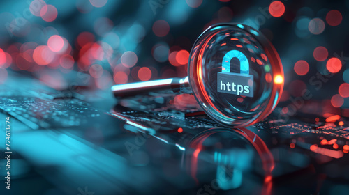 Magnifying glass focusing on Https sign with a padlock symbol, against a motherboard blue background with copy space, SEO term for a safe encrypted connection on Internet with SSL certificate.