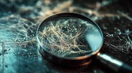 Magnifying glass over a strand of hair, showing extreme detail on a forensic investigation table