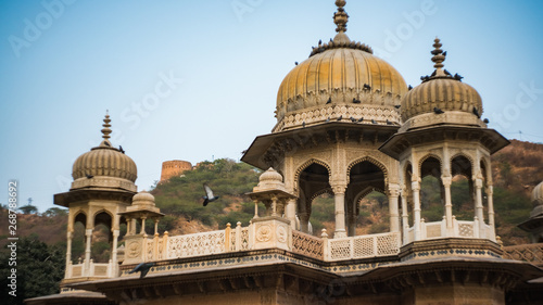 Maharaja style intricately carved buildings in Gaitor, Jaipur, India