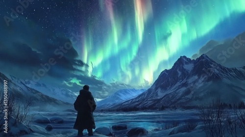 Majestic Aurora Borealis over Snowy Mountains, Awe-Inspiring Winter Landscape