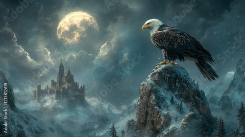 Majestic bald eagle perched on snowy mountain peak under a full moon, overlooking a distant castle.