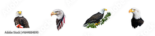 Majestic bald eagle with patriotic ribbon and green foliage against black, cut out transparent
