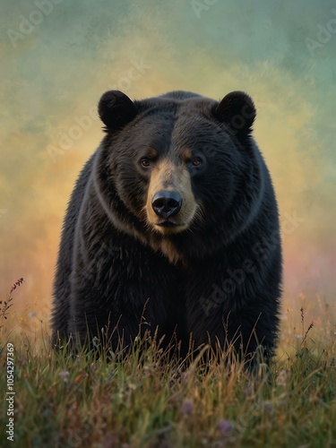 Majestic black bear on a soft pastel background.