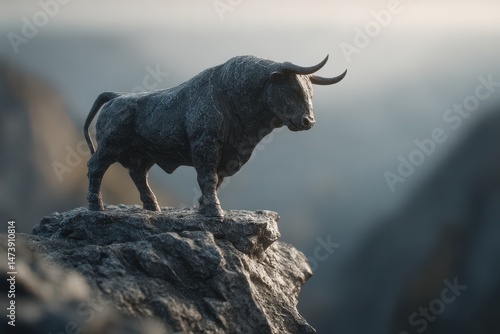 Majestic bull sculpture perched atop a craggy mountain peak.