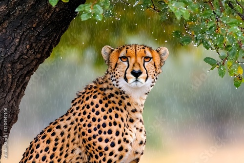 Majestic Cheetah Relaxing Under Rainy Tree Canopy in Wilderness
