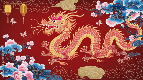 Majestic Chinese Dragon with Cherry Blossoms and Lanterns