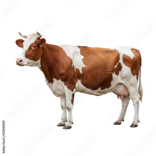 Majestic dairy cow with striking brown and white coat stands regally on display isolated